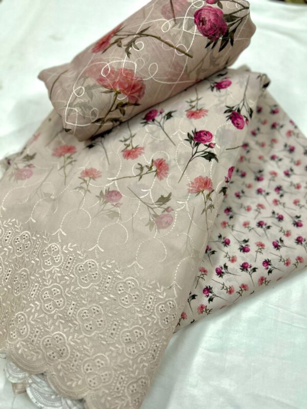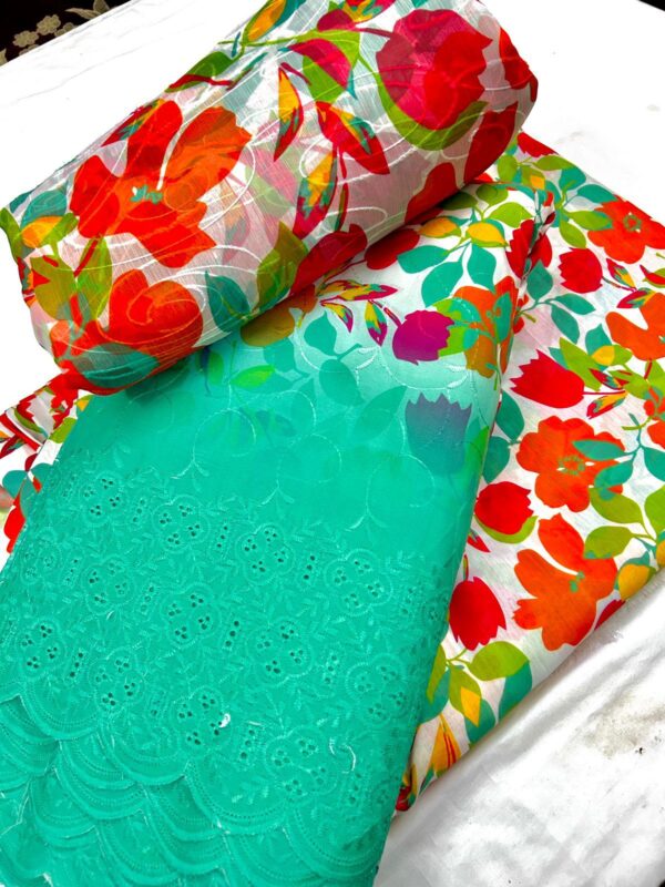 A captivating fabric set adorned with delicate floral prints and elegant embroidery.