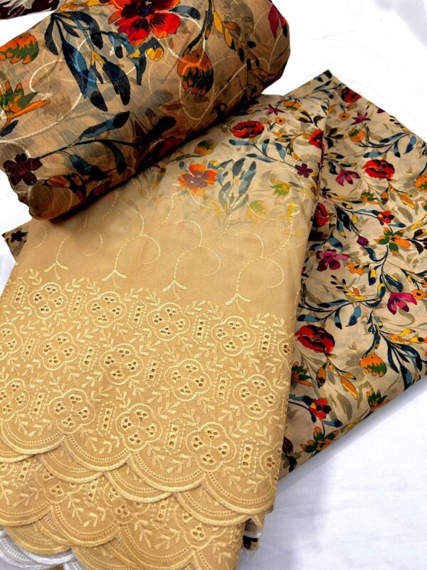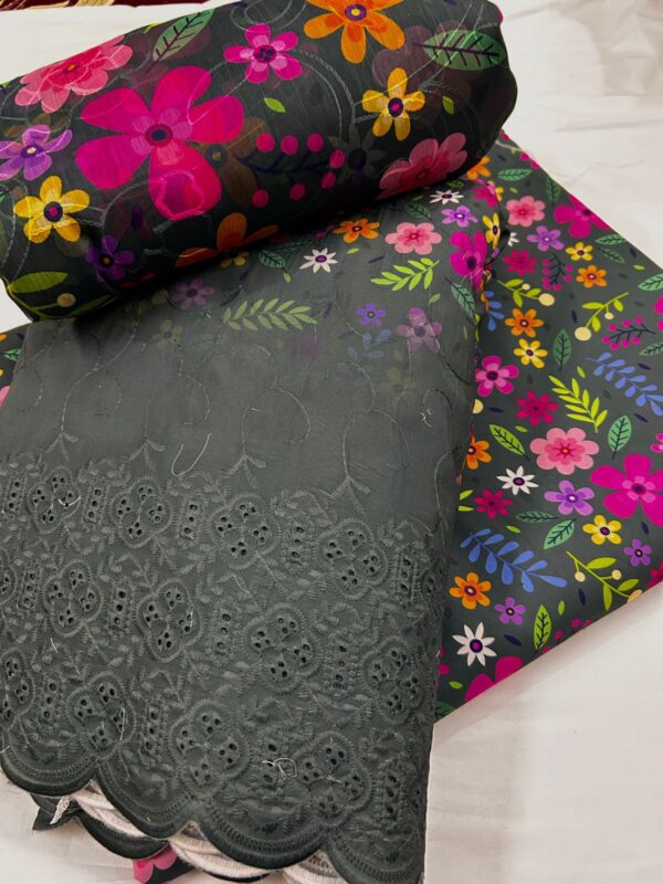 Chicken-kari Shirt with Scalap Cutwork Border, SWISS Printed trouser Chiffon Emb Dupatta
